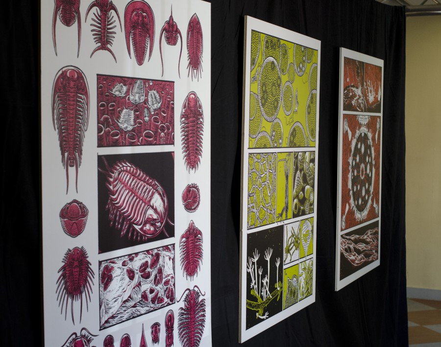Au travers de douze reproductions, l’exposition nous plonge au cœur d’Alpha, un chef-d’œuvre graphique à la monochromie éblouissante, poétique, une épopée bouillonnante qui raconte quatorze milliards d’années de l’histoire de l’humanité ! Jens Harder utilise le langage de la bande dessinée mais ici, point de personnage récurrent, pas de texte et les seules bulles sont celles de lave en fusion... C’est le dessin et seulement le dessin qui parle, le trait est appuyé, réaliste.