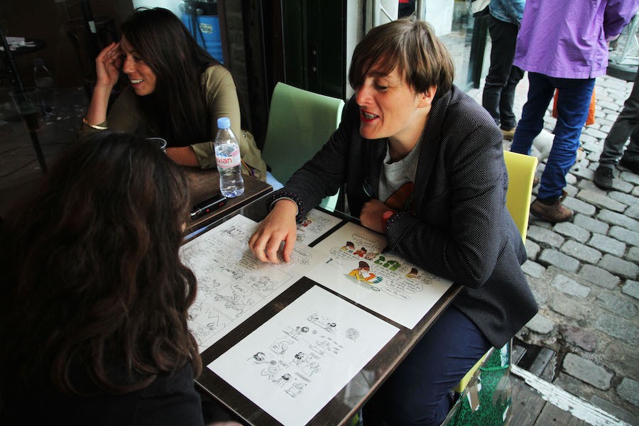 Avec son dessin, savant mélange de charmantes petites bestioles mal peignées, fagotées dans des frusques funky et à la langue bien pendue, ses dialogues et son humour ciselés à la brosse à dent ; elle déboule dans les années 2000, sans mettre les patins, sur le parquet ciré de la bd, après avoir fréquenté le milieu enfumé, de l’illustration jeunesse. Elle fait ses débuts d’auteure bd dans Capsule cosmique avec Anna et Froga (5 tomes chez Sarbacane) et depuis, elle n’arrête pas de nous chercher avec ses bédés poilantes et même stimu- lantes (Coucous Bouzon chez Gallimard ; Planplan culcul aux Requins Marteaux) ! On sait comment ça commence donc, mais heureusement, c’est bien loin d’être fini !