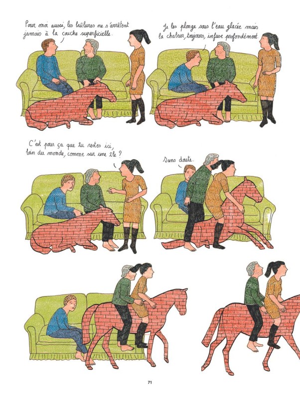 Anouk Ricard a ingéré des pages et des pages de bande dessinée et c’est de cette orgie qu’elle a fait son style, à nul autre pareil ! On entend dire que son dessin est naïf et que son humour est absurde ! Bien sûr, on la sent bien traversée par des courants d’influences comme Goossens ou Pierre La Police, maîtres s’il en est de l’absurde, mais laissons donc les analyses aux analystes. Pour nous, Anouk Ricard c’est plutôt comme faire de la trottinette sur l’autoroute ou encore sauter à l’élastique avec une grenadine-wasabi à la main ! C’est cool et tellement drôle! On ne sait jamais vraiment si elle parle à l’enfant qui roupille en nous ou si elle s’adresse aux enfants comme s’ils étaient intelligents !