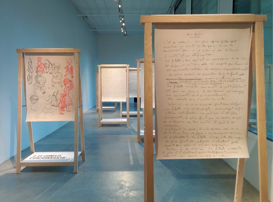 telle mission, il doit tout d’abord connaitre les moyens à disposition: la qualité de l'impression, les encres, le papier... Puis passer au dessin. Pas besoin d'utiliser des matériaux forcément "nobles", d'ailleurs, des matériaux très modestes peuvent sonner étonnamment justes. Enfin, partir au combat, tête baissée, faire entrer le texte en conflit avec l’image, rater un trait, effacer ses traces, recommencer sans jamais savoir si la victoire est à sa portée ... Cette exposition est le récit d'une bataille rangée.